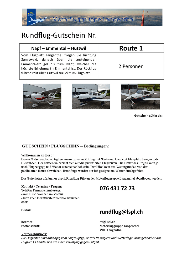 Vom Flugplatz Langenthal fliegen Sie Richtung Sumiswald, danach über die ansteigenden Emmentalerhügel bis zum Napf, welcher die höchste Erhebung im Emmental ist. Der Rückflug führt direkt über Huttwil zurück zum Flugplatz.