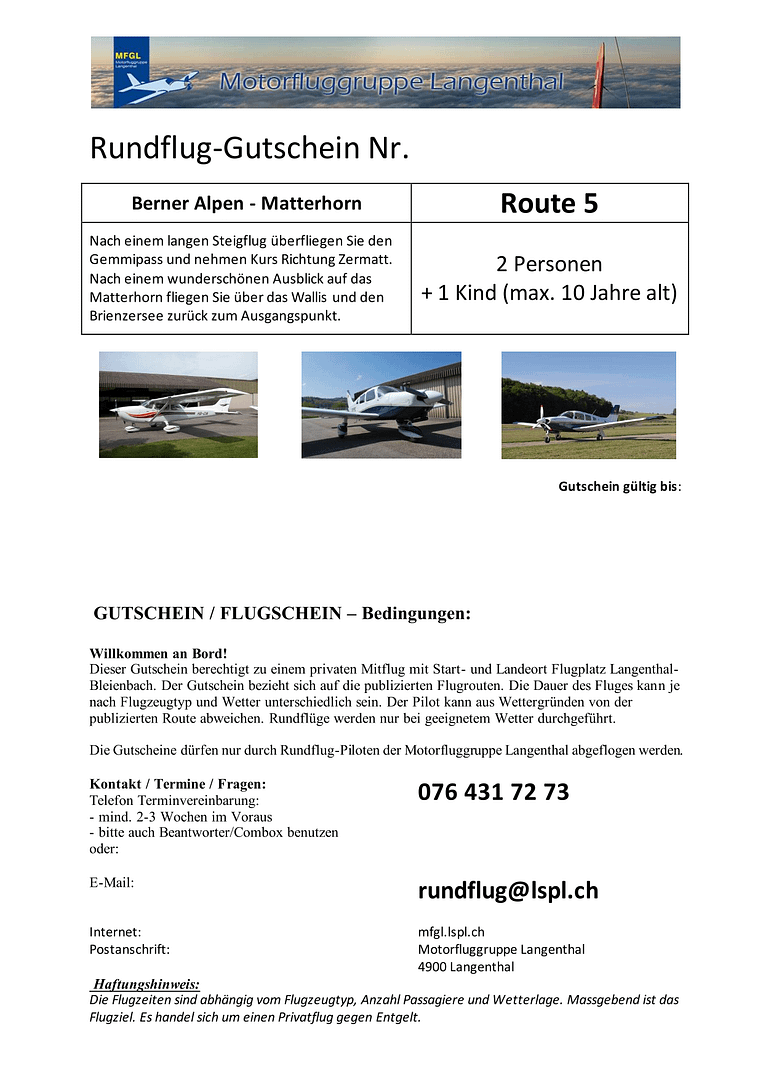 Achtung: Das Gesamtgewicht der Passagiere ist begrenzt. Im Zweifelsfall vor dem Bestellen des Gutscheins mit dem Rundflugteam (076 431 72 73) klären.